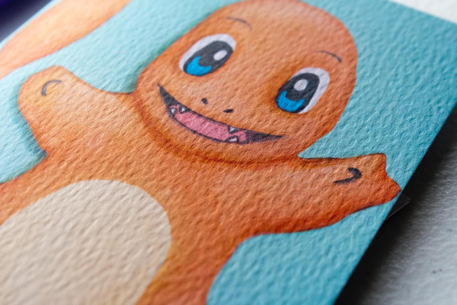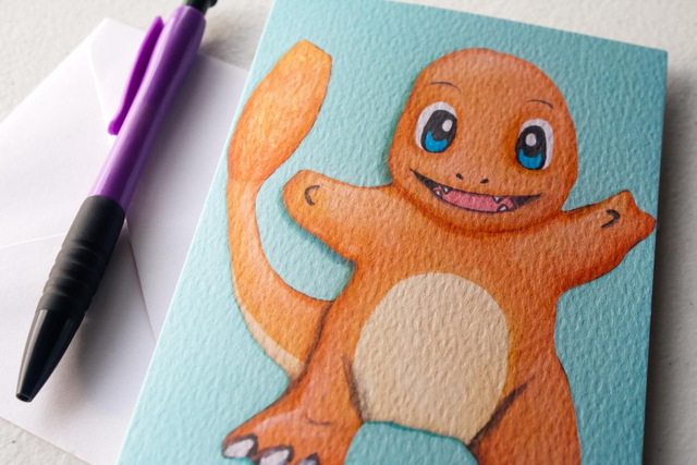 Greetings card featuring Charmander Pokemon. This premium card reproduces a stunning Purple Faye Art 3D acrylic painting of the beloved Pokemon character Charmander. Perfect for Pokemon fans, gaming enthusiasts, and anime lovers.