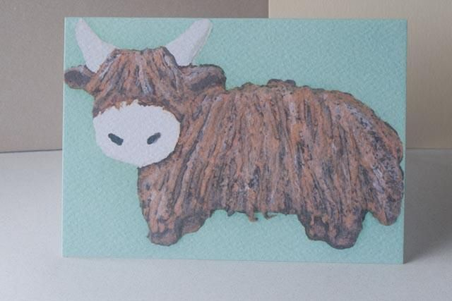 Greetings card featuring a magnificent Highland cow on textured card. Reproduction of a Purple Faye Art original 3D acrylic painting.