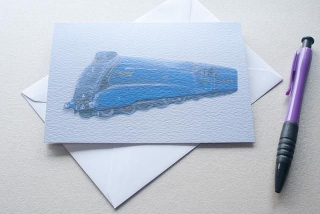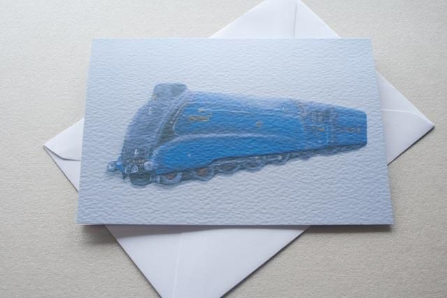 Greetings card featuring the legendary Mallard steam locomotive on textured card. Reproduction of a Purple Faye Art original 3D acrylic painting.