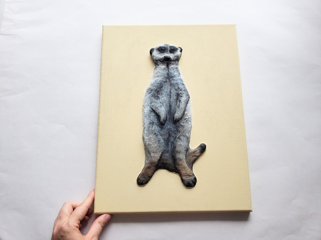 This extraordinary original 3D acrylic painting features a magnificent meerkat with incredible depth and texture. Artist Purple Faye's innovative technique uses cardboard layered up and covered in modroc (plaster of Paris bandages) to create a three-dimensional effect that brings this wildlife art to life.