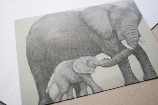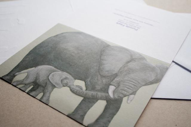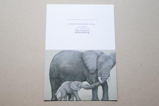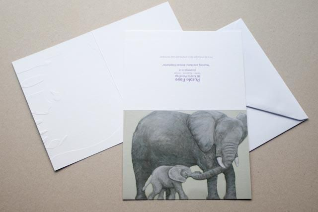 Embossed greetings card featuring Mummy and Baby African Elephants. Reproduction of a Purple Faye Art original 3D acrylic painting.