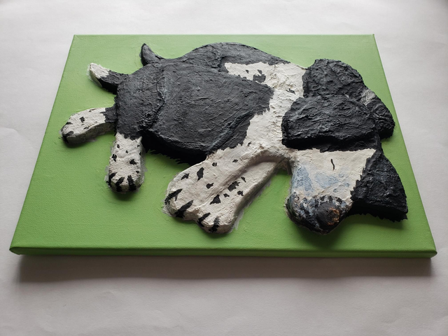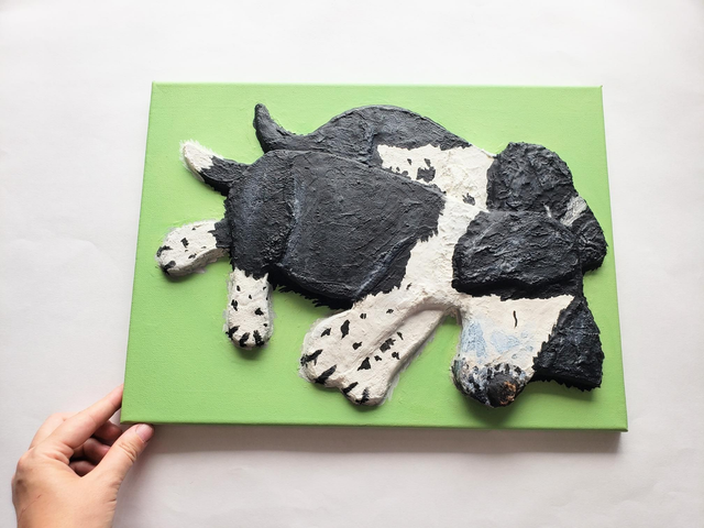 This original 3D acrylic painting of sleeping puppies spaniel dogs, made by artist Purple Faye, is 12x16Inches approx (30x40cm approx) ready to hang with a certificate of authenticity. Only one available.