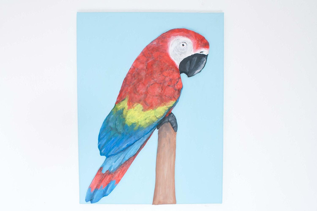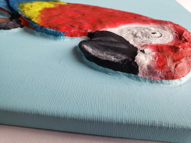 This stunning one-of-a-kind artwork features a vibrant Scarlet Macaw (also called red and yellow, red and blue or red breasted macaw) . Showing the bird's plumage using the artists signature technique of using layered cardboard covered in modroc (plaster bandages).and painted with acrylic paints.