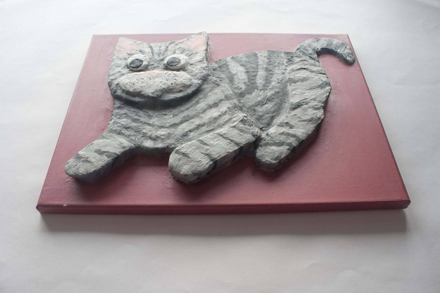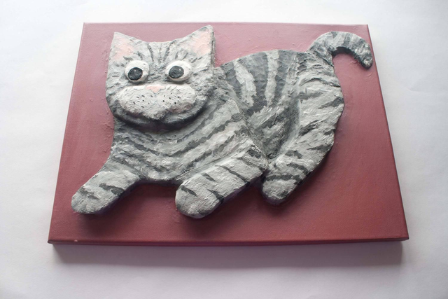 'Silver Tabby' cat with cartoon googly eyes, Original 3D Acrylic Painting by Artist Purple Faye.