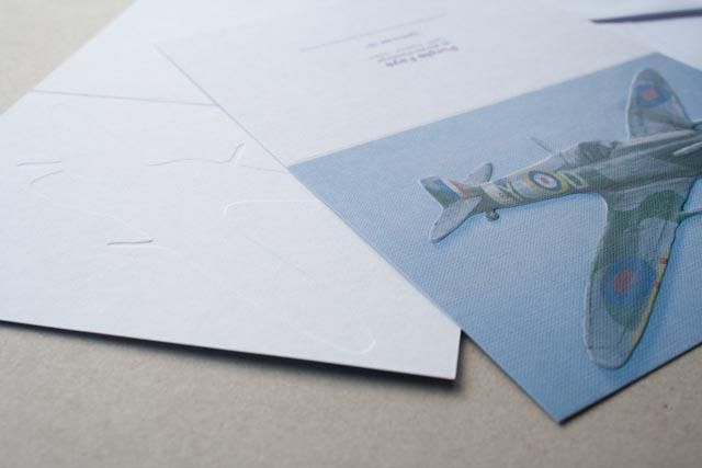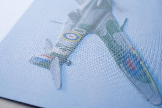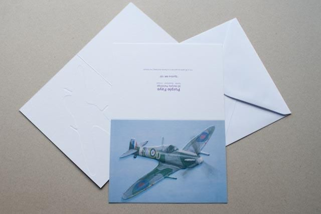 Embossed greetings card featuring the legendary Spitfire aircraft. Reproduction of a Purple Faye Art original 3D acrylic painting.