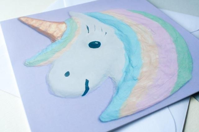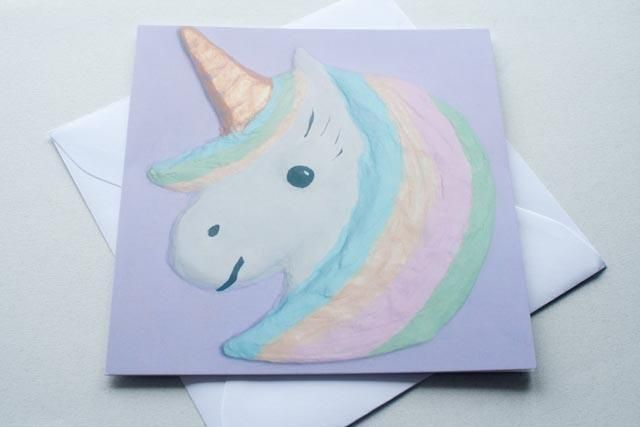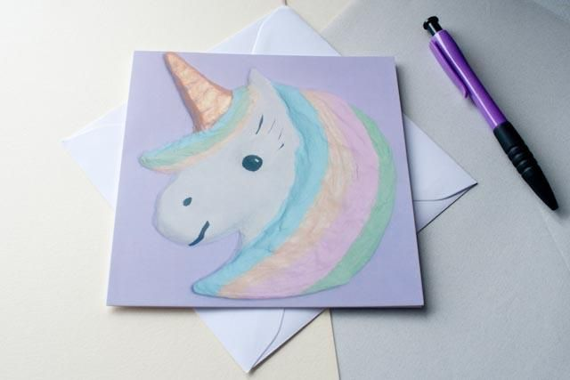 Greetings card featuring a magical unicorn's head. Reproduction of a Purple Faye Art original 3D acrylic painting.